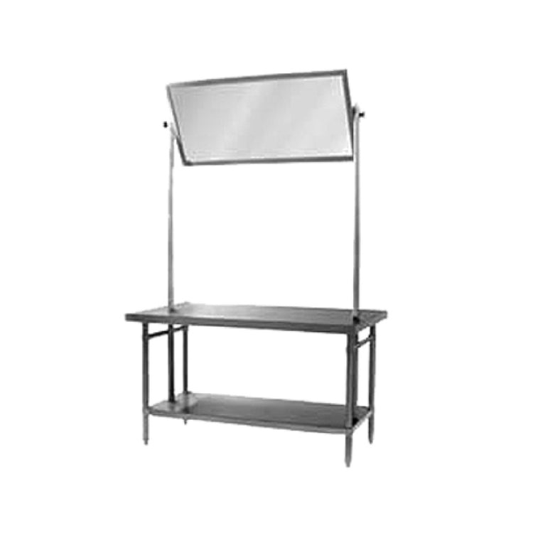 The Eagle DT3672SE-X Spec-Master® Demo Table is a versatile and durable demonstration station designed for professional settings, measuring 72 inches wide, 36 inches deep, and 88 inches high. This table features a 14/304 stainless steel top, known for its strength and resistance to corrosion, making it ideal for rigorous use in the foodservice industry, educational environments, and trade shows. The table is equipped with a box marine edge on all sides, providing added protection against spills and ensuring a clean workspace. Additionally, it includes an adjustable stainless steel undershelf, offering flexible storage solutions to accommodate varying operational needs. The acrylic mirror tilting frame, complete with a locking knob, allows for customizable viewing angles, enhancing demonstration effectiveness. Supported by stainless steel legs and adjustable bullet feet, this table ensures stability and can adapt to uneven surfaces. The inclusion of the Uni-Lok® gusset system further enhances its structural integrity, making it a reliable choice for intensive usage. The Eagle DT3672SE-X is NSF certified, reflecting its adherence to public health standards, and stands as a testament to quality and innovation in professional table design, meeting the diverse needs of chefs, educators, and exhibitors.