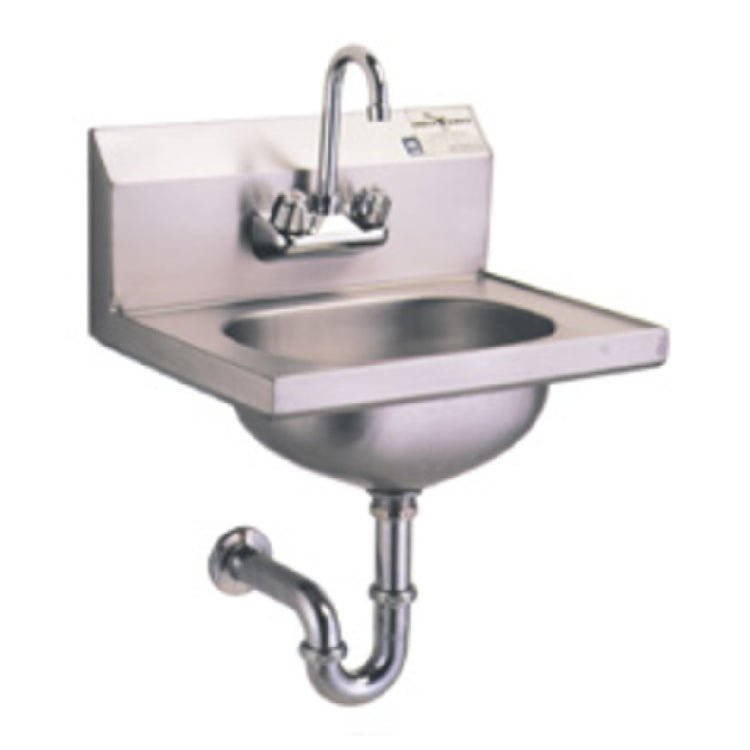 The Eagle HSA-10-FA Hand Sink is a high-quality, wall-mounted unit designed for efficiency and durability in various professional settings. Measuring 13-1/2" wide, 9-3/4" front-to-back, and featuring a 6-3/4" deep bowl, this sink offers a compact yet ample basin for handwashing needs. Constructed from 304 stainless steel, it ensures longevity and resistance to corrosion, making it ideal for both commercial kitchens and healthcare facilities. The sink is equipped with a splash mount gooseneck faucet, which provides a steady water flow and enhances ease of use. Additionally, the inclusion of a P-trap and tail piece facilitates effective drainage, while the basket drain aids in preventing clogs. The deep-drawn seamless design with a positive drain and inverted "V" edge ensures efficient water flow and minimizes water pooling, thus maintaining hygiene standards. Certified by NSF, this hand sink meets the strict public health and safety requirements, making it a reliable choice for establishments that prioritize cleanliness and sanitation. The Eagle HSA-10-FA Hand Sink is an excellent solution for industries that demand high-performance handwashing stations, combining a sleek design with practical functionality.