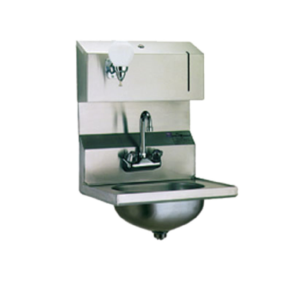The Eagle HSA-10-FDP Hand Sink Wall Mount is meticulously crafted for environments requiring efficient and hygienic handwashing solutions. This hand sink features a compact design with dimensions of 13-1/2 inches in width, 9-3/4 inches front-to-back, and a 6-3/4 inch deep bowl, ideal for maximizing space in tight areas. Constructed from 304 stainless steel, it ensures durability and resistance to corrosion, making it suitable for both commercial and industrial settings. The inclusion of a splash mount gooseneck faucet provides ease of use and accessibility for quick handwashing. Designed with a 1/2 inch NPS water inlet, it ensures a steady and reliable water supply. The sink is equipped with convenient towel and soap dispensers, promoting efficient hygiene practices. Its deep-drawn seamless design and positive drain feature facilitate effective water management, while the inverted "V" edge helps prevent overflow, ensuring a clean work environment. The basket drain is an added convenience for easy water drainage. Certified by NSF, this hand sink meets stringent public health and safety standards, making it an exemplary choice for food service operations, healthcare facilities, and laboratories that prioritize sanitation and efficiency.