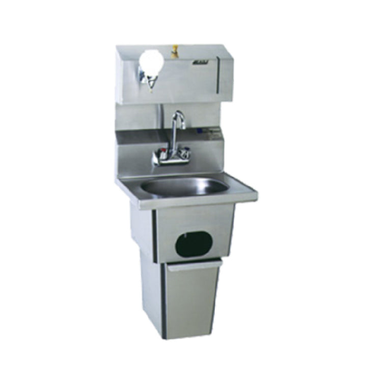 The Eagle HSA-10-FDP-T Hand Sink is a wall-mounted unit that stands out with its precise dimensions of 13-1/2" width, 9-3/4" front-to-back, and a 6-3/4" deep bowl, making it a compact yet efficient solution for various professional settings. Constructed from 304 stainless steel, it assures long-lasting durability and resistance to corrosion, which is essential for maintaining hygiene standards. This hand sink features a splash mount gooseneck faucet, designed to provide easy access and comfortable use. It includes both towel and soap dispensers, enhancing convenience for users by providing all necessary sanitation tools in one location. The incorporation of a basket drain and a seamless deep-drawn bowl facilitates a positive drain and prevents any water accumulation, ensuring smooth operation and easy maintenance. Its inverted "V" edge design minimizes water spillage and enhances safety. Additional features such as a waist skirt and waste receptacle contribute to its practicality in high-demand environments. Certified by NSF, this hand sink meets strict public health and safety standards, making it a reliable choice for industries such as food service, healthcare, and hospitality, where hygiene and efficiency are paramount.