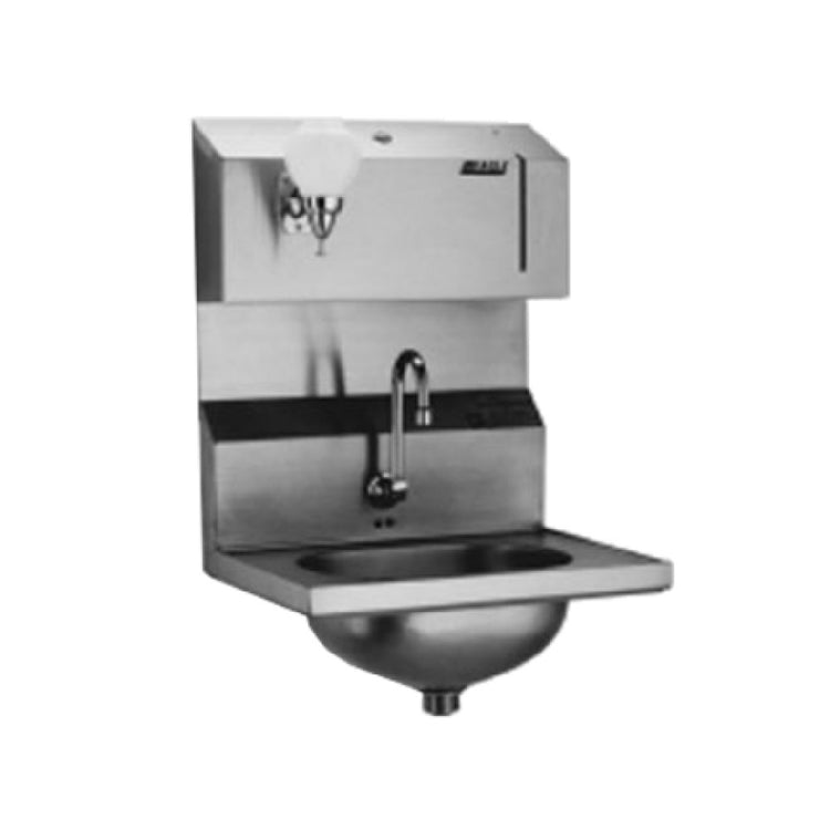 The Eagle HSA-10-FDPE-B Hand Sink Wall Mount is a specialized sanitation solution designed for environments requiring compact, efficient hygiene stations. Measuring 13-1/2 inches in width, 9-3/4 inches front-to-back, and featuring a 6-3/4 inch deep bowl, this sink is engineered for space efficiency without sacrificing functionality. Constructed from durable 304 stainless steel, it is built to withstand rigorous use while ensuring long-term reliability. A standout feature is its battery-powered electronic eye gooseneck spout, promoting touch-free operation to enhance cleanliness and prevent cross-contamination. The inclusion of integrated soap and towel dispensers adds convenience, making it ideal for high-traffic areas. The deep-drawn positive drain sink bowl ensures efficient water removal, supported by a basket drain system that prevents clogging. The 7-1/2 inch high backsplash helps protect walls from water damage, maintaining the integrity of surrounding surfaces. This hand sink is fully welded, ensuring durability and ease of maintenance, and comes complete with mounting brackets for secure installation. Its inverted "V" edge design minimizes water splashing, contributing to a safer and cleaner workspace. NSF certification underscores its compliance with health and safety standards, making it a reliable choice for various industry applications requiring stringent hygiene standards.