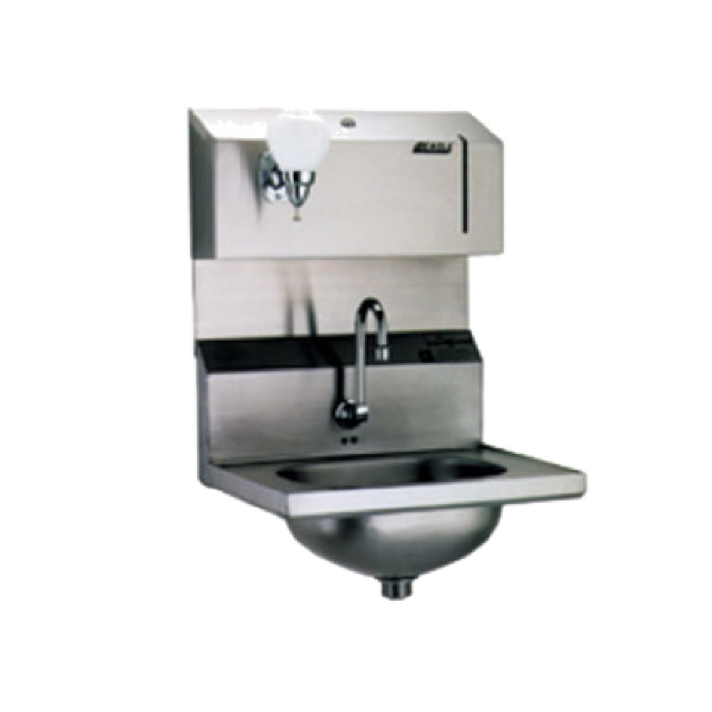 The Eagle HSA-10-FDPE Hand Sink is a wall-mount unit designed to meet the rigorous demands of commercial environments. With a compact footprint of 13-1/2" wide by 9-3/4" front-to-back, and a 6-3/4" deep bowl, this hand sink is constructed from high-quality 304 stainless steel, ensuring durability and longevity. Its electronic eye gooseneck spout allows for hands-free operation, enhancing hygiene and convenience in busy settings. An integrated soap and towel dispenser bring added functionality, while the basket drain and deep-drawn positive drain sink bowl provide efficient water disposal. The unit features a 7-1/2" high backsplash to protect walls from water splashes, and its all-welded design enhances structural integrity. Mounting brackets are included for easy installation, and the sink's inverted "V" edge design helps contain spills. Certified by NSF, this hand sink meets strict public health and safety standards, making it suitable for a variety of industry settings, including healthcare, food service, and hospitality. This versatile and reliable hand sink solution offers superior performance, making it an essential fixture for environments where sanitation and efficiency are paramount.