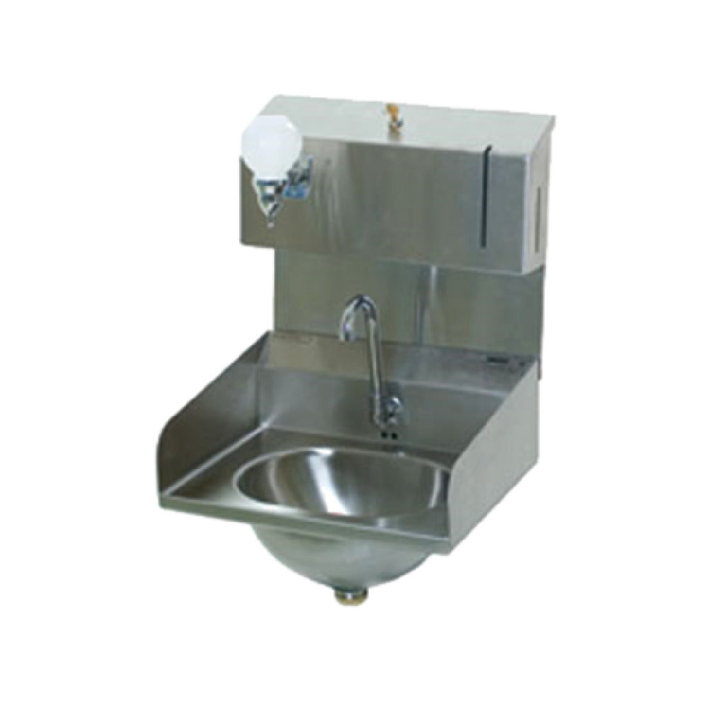 The Eagle HSA-10-FDPE-LRS-1X Hand Sink is engineered for precise functionality in various industrial environments, offering a compact and efficient solution with its dimensions of 13-1/2 inches wide, 9-3/4 inches front-to-back, and a 6-3/4-inch deep bowl. Constructed from 304 stainless steel, this wall-mounted hand sink ensures durability and resistance to corrosion, a crucial feature for settings requiring stringent hygiene standards. It is equipped with side splashes on both ends to minimize water spillage, maintaining cleanliness in surrounding areas. A standout feature is its 12-volt adapter powered electronic eye gooseneck spout, promoting water conservation and reducing touchpoints for enhanced sanitary conditions. The seamless, deep-drawn design incorporates a positive drain and an inverted "V" edge, facilitating efficient water flow and preventing overflow. Complementing its practical design are integrated soap and towel dispensers, streamlining handwashing practices. The inclusion of a basket drain further emphasizes its efficient water management capabilities. This hand sink is NSF certified, affirming its compliance with health and safety standards, making it an ideal choice for sectors such as hospitality, healthcare, and food service, where hygiene and operational efficiency are paramount. This product's thoughtful design and robust construction underscore its value across multiple industry segments.