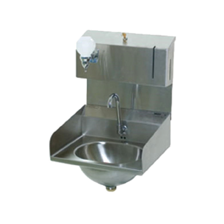 The Eagle HSA-10-FDPE-LRS Hand Sink is a precision-engineered wall-mounted unit with a compact design measuring 13-1/2 inches wide, 9-3/4 inches front-to-back, and a bowl depth of 6-3/4 inches, making it an ideal choice for various industries requiring efficient handwashing solutions. Crafted from durable 304 stainless steel, it promises longevity and resistance to corrosion. Featuring side splashes on both ends, this sink minimizes water spillage, enhancing cleanliness and safety. It includes a 1/2-inch NPS water inlet for reliable water supply connections. A standout feature is its 12-volt adapter-powered electronic eye gooseneck spout, which facilitates touchless operation, promoting hygiene. Further enhancing functionality, the sink is equipped with built-in soap and towel dispensers, offering convenience in busy environments. The basket drain ensures efficient water drainage, complemented by a deep-drawn seamless design for a positive drain experience. Its 120v/60/1-ph inverted "V" edge design adds to its structural integrity. NSF certification guarantees compliance with strict public health standards. The Eagle HSA-10-FDPE-LRS Hand Sink is a highly suitable option for commercial kitchens, healthcare facilities, and food processing industries, providing a compact yet efficient handwashing station that prioritizes hygiene and durability.