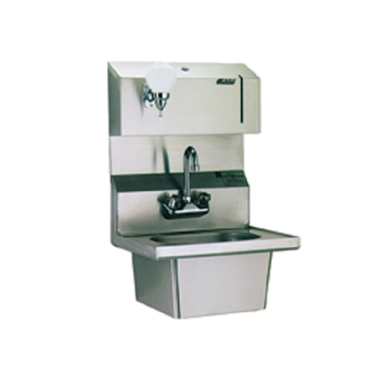 The Eagle HSA-10-FDPS Hand Sink is a highly efficient wall-mounted unit, perfect for a variety of environments where space and hygiene are crucial. Measuring 13-1/2 inches wide, 9-3/4 inches front-to-back, and 6-3/4 inches deep, this sink is compact yet practical, making it suitable for both commercial and institutional settings. Constructed from 304 stainless steel, it promises durability and longevity, even in high-traffic areas. The sink features a splash mount gooseneck faucet, enhancing usability by providing ample clearance for washing hands. The 1/2-inch NPS water inlet ensures a reliable water connection. Additionally, the integrated soap and towel dispensers streamline operations, making it a convenient all-in-one solution. The stainless steel skirt offers a sleek finish, while the basket drain facilitates efficient water flow. The deep-drawn seamless design with a positive drain and an inverted "V" edge minimizes water spillage and maximizes cleanliness, which is crucial for maintaining hygiene standards. Certified by NSF, this hand sink meets rigorous health and safety standards, making it a trusted choice for healthcare facilities, food service operations, and any setting where sanitation is paramount.