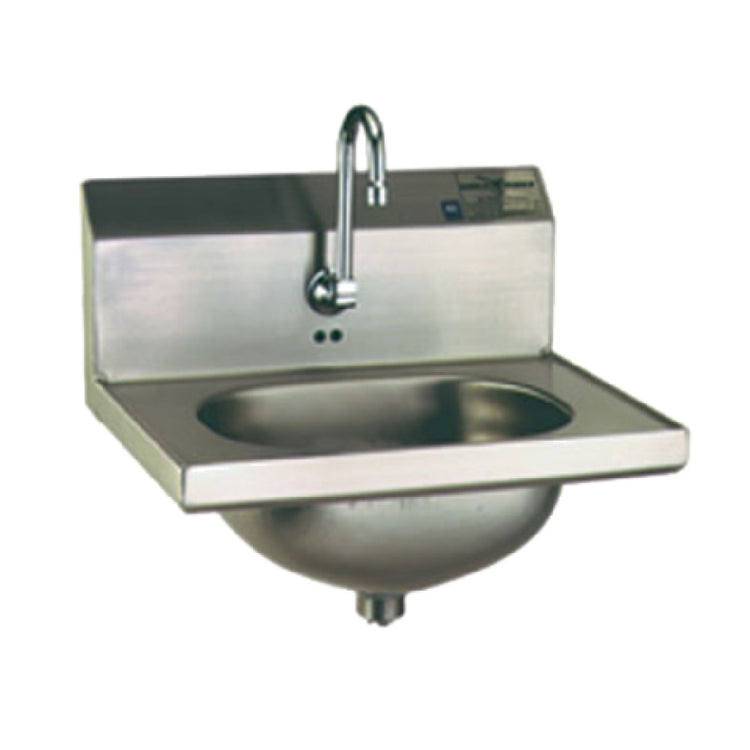 The Eagle HSA-10-FE-1X Hand Sink is an industrial-grade wall-mounted unit measuring 13-1/2 inches wide, 9-3/4 inches front-to-back, and 6-3/4 inches deep, crafted to meet the rigorous demands of various industry segments. Constructed from 304 stainless steel, this hand sink is designed for durability and resistance to corrosion, making it suitable for environments where hygiene and longevity are paramount. It features an electronic eye gooseneck spout for hands-free operation, enhancing sanitation and convenience. The basket drain ensures efficient water management, while the deep-drawn positive drain sink bowl facilitates swift water evacuation. A 7-1/2 inch high backsplash is integrated to protect walls from water damage. The all-welded construction of the sink ensures robust assembly, and it includes mounting brackets for straightforward installation. The inverted "V" edge design aids in directing water into the bowl, reducing spillage. Certified by NSF, this hand sink adheres to stringent public health and safety standards, making it an ideal choice for commercial kitchens, laboratories, and healthcare facilities where maintaining high hygiene standards is crucial.