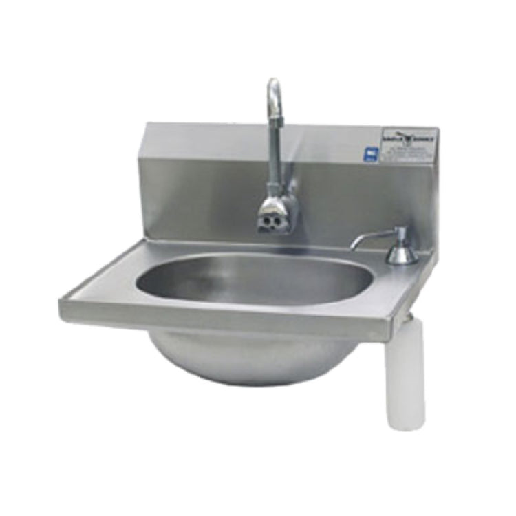 The Eagle HSA-10-FE-B-DS Hand Sink is a versatile wall-mounted unit, perfectly suited for various industries requiring stringent hygiene standards. With dimensions measuring 13-1/2 inches in width, 9-3/4 inches front-to-back, and a bowl depth of 6-3/4 inches, this sink provides ample space for efficient handwashing. Crafted from 304 stainless steel, it ensures durability and resistance to corrosion, making it ideal for both commercial and industrial use. This hand sink is equipped with a battery-powered electronic eye gooseneck spout, enhancing user convenience and promoting touch-free operation, which is crucial in settings where sanitation is paramount. The inclusion of a basket drain aids in effective water drainage, preventing blockage and maintaining hygiene. Additionally, a deck mount soap dispenser is integrated for easy access to soap, ensuring a complete handwashing experience. Its deep-drawn seamless design with a positive drain feature minimizes water retention and simplifies cleaning. The sink comes with stainless Z-brackets for secure wall mounting and features an inverted "V" edge design, adding to its structural integrity. Certified by NSF, this hand sink meets high public health and safety standards, making it a reliable choice for healthcare facilities, food service establishments, and laboratories.