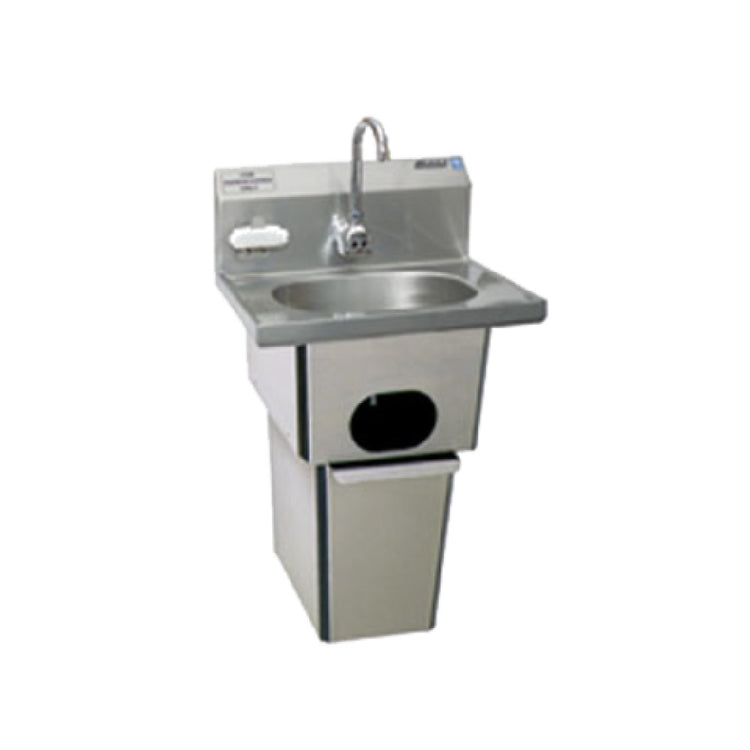 The Eagle HSA-10-FE-B-T-NB-MG Hand Sink MICROGARD® Wall Mount is a compact yet efficient sanitation solution designed for environments that require rigorous hygiene standards. Measuring 13-1/2 inches in width, 9-3/4 inches front-to-back, and 6-3/4 inches deep, this hand sink is crafted from durable 304 stainless steel, ensuring longevity and resistance to corrosion. The deep-drawn seamless construction with a positive drain and inverted "V" edge enhances user convenience by minimizing splash and ensuring efficient drainage. It features a battery-powered electronic eye gooseneck spout that promotes touch-free operation, reducing the risk of cross-contamination. Included with the sink is a basket drain for efficient water flow, and a nail brush with a dedicated holder, essential for thorough hand cleaning. The unit also comes with a trash can, optimizing waste management in busy environments. Certified by NSF, this wall-mounted hand sink meets strict public health and safety standards, making it ideal for use in food service industries, healthcare facilities, and other hygiene-focused environments. The Eagle HSA-10-FE-B-T-NB-MG Hand Sink MICROGARD® is engineered to provide a reliable, space-saving handwashing solution tailored for high-demand use in professional settings.