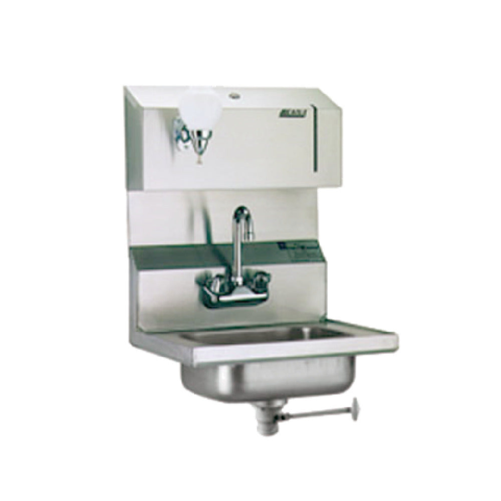 The Eagle HSA-10-FLDP Hand Sink is a compact, wall-mounted solution, measuring 14 inches wide, 10 inches front-to-back, and featuring a 5-inch deep bowl, making it ideal for small spaces in high-demand environments. Constructed from durable 304 stainless steel, this hand sink offers long-lasting performance and ease of sanitation. The splash mount gooseneck faucet provides easy access to water and efficient washing, while the 1/2-inch NPS water inlet ensures compatibility with standard plumbing systems. Complementing its practical design, the unit includes integrated towel and soap dispensers, promoting hygiene and convenience. The sink features a lever drain and a deep-drawn seamless design, ensuring positive drainage and minimizing water residue. Its inverted "V" edge adds an additional layer of protection against spills. The Eagle HSA-10-FLDP is NSF certified, assuring compliance with rigorous health and safety standards. This hand sink is particularly valuable in various settings, such as commercial kitchens, healthcare facilities, and industrial environments, where space and functionality are paramount. Its thoughtful design and superior materials make it a reliable choice for professionals seeking a blend of practicality and efficiency in their handwashing solutions.