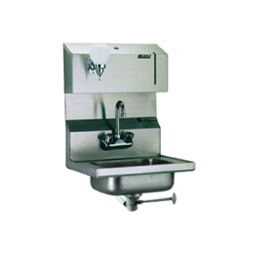 The Eagle HSA-10-FODP Hand Sink Wall Mount is a meticulously crafted fixture, specifically designed to meet the rigorous demands of commercial and industrial environments. Measuring 14 inches in width, 10 inches front-to-back, and 5 inches deep, this sink is engineered to fit compact spaces while providing ample washing capacity. Constructed from high-quality 304 stainless steel, it offers exceptional durability and resistance to corrosion, making it ideal for long-term use in various professional settings. The splash mount gooseneck faucet provides ease of use and ensures efficient water flow. Equipped with a polymer lever drain featuring an overflow, the sink ensures effective water management. The 1/2-inch NPS water inlet facilitates easy connection to existing plumbing systems. Additional features include integrated towel and soap dispensers, enhancing convenience and promoting hygiene. The deep-drawn seamless design contributes to a positive drain experience, reducing water pooling, while the inverted "V" edge adds to its aesthetic appeal and safety. Certified by NSF, this hand sink adheres to strict public health and safety standards. The Eagle HSA-10-FODP Hand Sink Wall Mount is a reliable choice for sectors requiring stringent hygiene practices, including food service, healthcare, and laboratory applications, where space efficiency and robust performance are paramount.