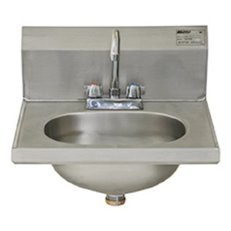 The Eagle HSAD-10-F Hand Sink Wall Mount is a meticulously engineered sanitary solution designed for compact spaces, measuring 13-1/2 inches wide, 9-3/4 inches front-to-back, and 6-3/4 inches deep. Constructed from 304 stainless steel, this hand sink ensures longevity and reliability in demanding environments. It features a mounted gooseneck faucet, providing an elegant and practical water dispensing solution. The sink includes a basket drain that ensures efficient waste management. Its deep-drawn seamless design promotes hygiene by reducing potential bacteria harbor points. The positive drain feature ensures effective water flow, preventing water stagnation. An inverted "V" edge adds an additional layer of water containment and spill prevention. NSF certification confirms its compliance with public health and safety standards, making it suitable for diverse applications, from restaurant kitchens to healthcare facilities. The Eagle HSAD-10-F is crafted to deliver an exceptional balance of functionality and durability, catering to professionals seeking top-tier handwashing solutions that meet rigorous industry demands while maintaining a sleek and efficient design.