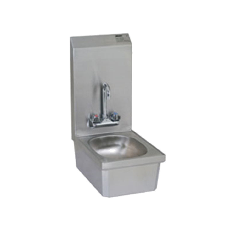 The Eagle HSANT-FS Hand Sink Wall Mount is expertly crafted for seamless integration into various professional environments, specifically tailored for high standards in hygiene management. Measuring 9-3/4" x 13-1/2" with a depth of 6-3/4", this sink is engineered for space-efficient functionality. It features a splash mount gooseneck faucet designed to minimize water splatter, making it ideal for maintaining cleanliness in confined areas. The 19-1/2" backsplash provides additional protection against water damage to walls, a crucial aspect for maintaining sanitary conditions in commercial settings. Constructed from 304 stainless steel, the sink ensures long-lasting durability and resistance to corrosion, meeting the rigorous demands of industries such as food service and healthcare. The inclusion of a basket drain facilitates efficient water flow and debris capture, while the inverted "V" edge design aids in preventing spillage and overflow. The stainless steel skirt adds a layer of sleek aesthetic appeal and structural integrity. With NSF certification, the Eagle HSANT-FS Hand Sink guarantees compliance with national safety standards, making it a reliable choice for professionals seeking quality and efficiency in their handwashing solutions across various industrial applications.