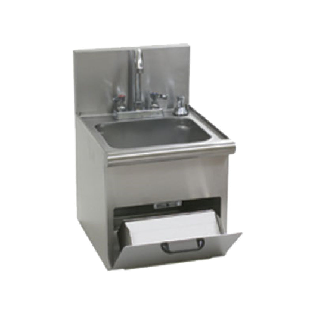 The Eagle HWC-E Space Saver Hand Sink is a meticulously designed unit, crafted to serve specific needs within demanding environments such as commercial kitchens and food service operations. With dimensions of 16-9/13" x 14" x 21-7/16"H, this sink is constructed from high-quality type 304 stainless steel, ensuring durability and resistance to corrosion. The unit features a bowl measuring 9-1/4" x 11-1/2" x 6", providing ample space for handwashing activities. The bullnose front edge adds a sleek design element while enhancing safety by minimizing sharp edges. Equipped with an Encore deck mount gooseneck faucet, the sink facilitates easy and efficient water flow management. Additional features include a basket drain for effective waste disposal and a soap dispenser conveniently located on the rear deck. The inclusion of a C-fold towel dispenser ensures quick and accessible hand drying. For secure access, the sink is fitted with a hinged door pull handle and magnetic catch. Certified by NSF, this sink meets stringent public health and safety standards, making it an ideal choice for various market segments requiring reliable and compact handwashing solutions.