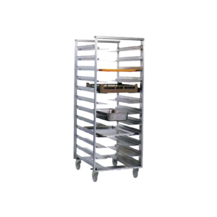 The Eagle MPR-10 Panco® Multi-Purpose Rack Mobile Front Loading is a versatile storage and transport solution designed for various industry needs. This rack features a robust welded square tubular aluminum construction, providing durability and strength for demanding environments. It is equipped with ten sets of universal slides on 2-1/2" centers, accommodating a wide range of trays and pans, making it an ideal choice for commercial kitchens, catering services, and food processing facilities. The rack's mobility is ensured by 5" swivel stem plated casters with non-marking rubber tread, allowing for easy maneuverability across different surfaces without leaving marks. This feature is particularly beneficial in maintaining clean and professional kitchen floors. The Eagle MPR-10 is shipped assembled, minimizing setup time and effort, and is NSF certified, ensuring it meets stringent public health and safety standards. Its front-loading design enhances accessibility and efficiency in high-paced environments, making it a valuable asset for operations that prioritize both functionality and hygiene. Whether you're storing baked goods, prepared meals, or ingredients, the Eagle MPR-10 Panco® Multi-Purpose Rack delivers reliable performance and adaptability for various storage needs.