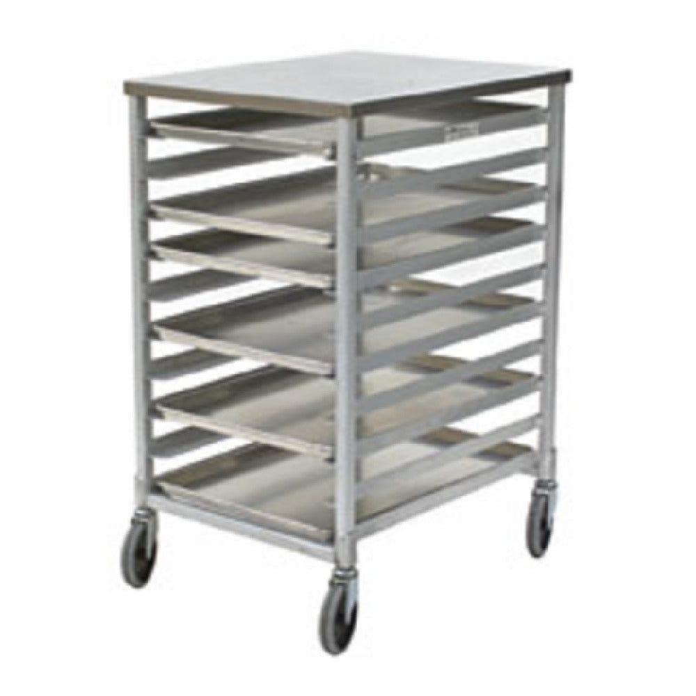 The Eagle OUR-1810-3/W Panco® Utility Rack Mobile Counter Height is a versatile storage solution designed to meet the dynamic needs of various industry segments. Featuring a welded extruded aluminum frame, this utility rack ensures durability and longevity. It is engineered with open sides and front loading capabilities, allowing for easy access and efficient organization. The rack is equipped with slides specifically designed to accommodate ten 18" x 26" pans, with slides positioned on 3" centers for optimal space utilization. Its counter-height design facilitates convenient integration into existing workspaces without obstructing workflow. The utility rack is also mobile, featuring 5" casters that offer smooth maneuverability across different surfaces, making it ideal for environments where flexibility and ease of movement are paramount. Whether used in commercial kitchens, bakeries, or food service operations, this utility rack provides a reliable and practical solution for organizing and transporting baking pans. Its robust construction and thoughtful design elements highlight its functionality and adaptability, catering to the specific requirements of professionals across the food service industry.