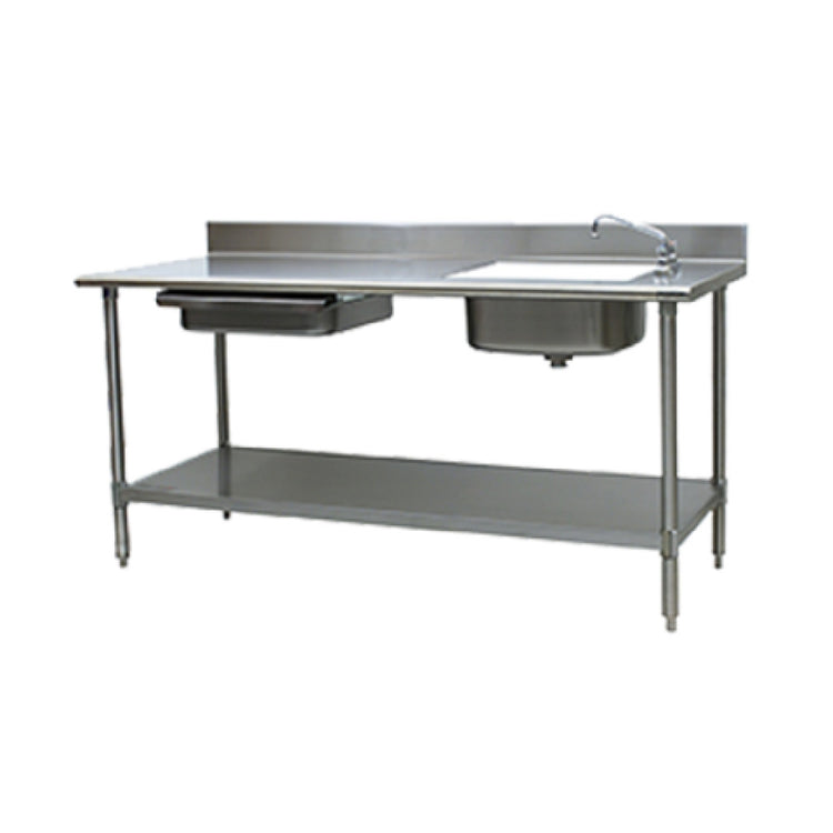 The Eagle PT 3096-R Spec-Master® Series Work Table With Prep Sink - 96"W x 30"D, is a versatile and high-performance work station designed to meet the rigorous demands of commercial kitchens. This work table features a top made of 14/304 stainless steel, ensuring durability and resistance to corrosion. It includes a 4-1/2"H backsplash for convenient spill control, and a rolled front edge for added safety. A standout feature is the integrated prep sink, located on the right, with a 20"W x 16"D front-to-back x 8" deep sink bowl, complemented by a deck mount gooseneck faucet for efficient water use. The left side of the table houses a 20" x 20" x 5" stainless steel drawer, providing ample storage space. The inclusion of a 1/2" thick polymer cutting board/sink cover enhances its functionality. Supporting the table is an adjustable stainless steel undershelf, along with robust stainless steel legs and adjustable bullet feet for stability on uneven surfaces. The table incorporates the Uni-Lok® gusset system for reinforced structural support. Certified by NSF, this work table is a valuable asset for any food service operation, offering a blend of functionality, durability, and efficiency.