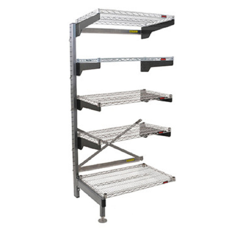 The Eagle Q1824VG76A-5 Q-LEVER Cantilever Add-On Shelving Unit is a versatile storage solution ideal for various industry applications, thanks to its robust design and ample capacity. This 5-tier unit measures 25-1/2"W x 23"D x 76"H overall, providing substantial vertical storage without demanding excessive floor space. It features five 24"W x 18"D wire shelves, each coated with a durable Valu-Gard® green epoxy finish, ensuring longevity even in challenging environments. The shelving unit is anchored by a single upright with a gray Valu-Master® finish, providing sturdy support for the entire structure. Adjustable leveling feet are included, allowing for stability on uneven surfaces, which is crucial for maintaining safety and organization in professional settings. Certified by NSF, this Eagle shelving unit meets rigorous public health and safety standards, making it suitable for use in healthcare facilities, laboratories, and food service operations, where both hygiene and reliability are paramount. The practical design of the Q-LEVER Cantilever Add-On Shelving Unit offers a unique value proposition by maximizing space efficiency and ensuring easy access to stored items, catering to the diverse needs of industries that require organized and accessible storage solutions.