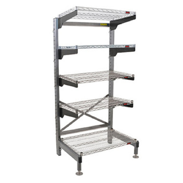 The Eagle Q1848VG76-5 Q-LEVER Cantilever Shelving Unit is a robust and versatile solution designed for optimal storage across various industries. This 5-tier shelving unit stands out with its overall dimensions of 52"W x 23"D x 76"H, ensuring ample storage space for diverse needs. Each of its five shelves measures 48"W x 18"D and is constructed from durable wire, featuring an innovative Valu-Gard® green epoxy finish that provides resilience and an appealing aesthetic. The unit's stability is enhanced by the inclusion of two uprights, finished with a sturdy gray Valu-Master® coating, ensuring long-lasting performance. Additionally, the adjustable leveling feet allow for adaptability on uneven surfaces, contributing to the unit's practicality in varied environments. Notably, the Eagle Q1848VG76-5 is NSF certified, underscoring its compliance with stringent health and safety standards. This feature-rich shelving unit is ideal for sectors such as warehousing, retail, and food service, where efficient, reliable storage solutions are paramount. Its combination of durability, adjustability, and compliance makes it an essential addition to any professional setting seeking organized and effective storage management.