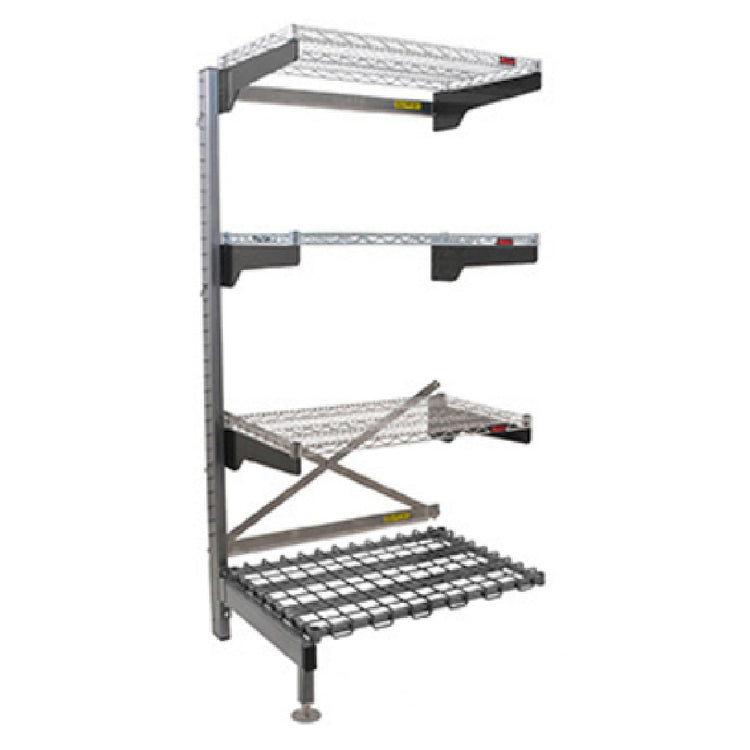 The Eagle Q1854V76A-4D Q-LEVER Cantilever Add-On Shelving Unit is a versatile storage solution, measuring 55-1/2"W x 23"D x 76"H. This 4-tier unit is designed with three 54"W x 18"D wire shelves, finished with a Valu-Master® gray epoxy coating that enhances durability and resistance to corrosion, making it an excellent fit for environments where hygiene is crucial. The unit also includes a bottom dunnage rack, which supports additional storage needs and helps distribute weight evenly for stability. Equipped with one upright featuring the same Valu-Master® gray finish, this shelving system provides robust support and is designed to integrate seamlessly with existing infrastructure. Adjustable leveling feet are included to ensure stability on uneven surfaces, enhancing the unit's adaptability in various settings. Certified by NSF, this shelving unit meets rigorous standards for public health protection, making it suitable for industries such as food service, healthcare, and commercial storage. The Eagle Q1854V76A-4D combines functionality with a professional finish, catering to the diverse storage requirements of businesses aiming to maximize space efficiency while maintaining high standards of cleanliness and compliance.