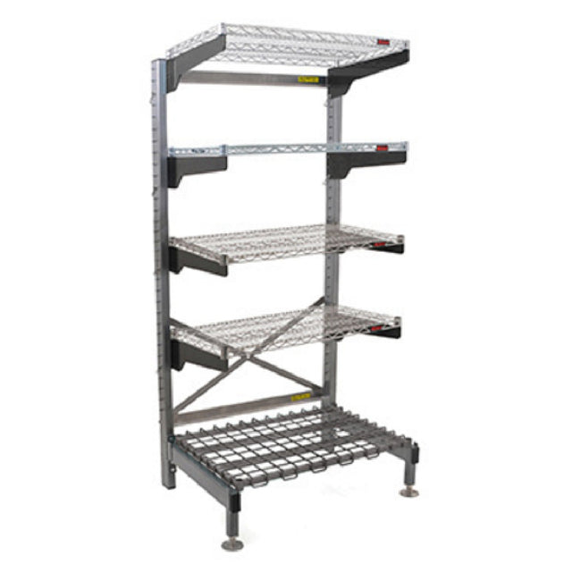 The Eagle Q2130V76-5D Q-LEVER Cantilever Shelving Unit is a versatile storage solution designed to meet the diverse needs of various industrial and commercial sectors. With a 5-tier configuration, this shelving unit stands at an overall size of 34"W x 26"D x 76"H, providing ample storage space within its compact footprint. It features four 30"W x 21"D wire shelves coated with a Valu-Master® gray epoxy finish, offering durability and resistance to corrosion. The inclusion of a bottom dunnage rack enhances its utility by accommodating heavier items. This cantilever shelving unit is supported by two sturdy uprights, also finished in Valu-Master® gray epoxy, ensuring stability and longevity. The adjustable leveling feet provide adaptability on uneven surfaces, making it suitable for a range of environments. Certified by NSF, the Eagle Q2130V76-5D meets stringent public health standards, assuring safety and reliability for use in sectors such as food service, medical facilities, and industrial storage. Its robust construction and adaptable design make it an essential asset for organizations aiming to optimize their storage capabilities while maintaining high standards of quality and performance.