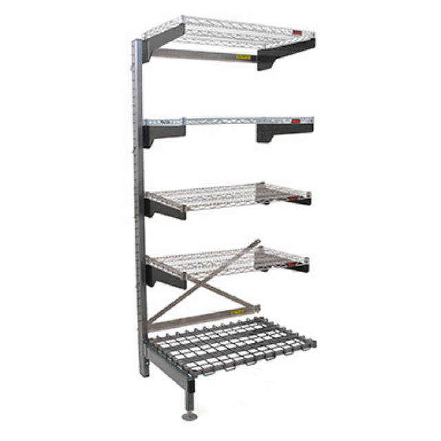 The Eagle Q2172VG86A-5D Q-LEVER Cantilever Add-On Shelving Unit is a robust storage solution designed to enhance organizational efficiency in various industry sectors. This 5-tier shelving unit measures 73-1/2"W x 26"D x 86"H, making it a versatile addition to any workspace requiring substantial storage capabilities. The unit features four 72"W x 21"D wire shelves, finished with Valu-Gard® green epoxy, which enhances durability and provides resistance against environmental factors. A bottom dunnage rack offers additional support for heavy-duty storage needs. The inclusion of one upright with a gray Valu-Master® finish complements the unit’s sturdy design. Adjustable leveling feet ensure stability across different floor surfaces, catering to diverse operational environments, from retail to industrial applications. NSF certification guarantees that this shelving unit meets high standards for public health protection, making it suitable for use in food service and healthcare settings. The Eagle Q2172VG86A-5D Q-LEVER Cantilever Add-On Shelving Unit is an exemplary choice for businesses looking to optimize space while maintaining a rigid organizational structure, backed by its durable construction and versatile design features. Its engineering is tailored to support the demanding needs of a wide range of professional settings.