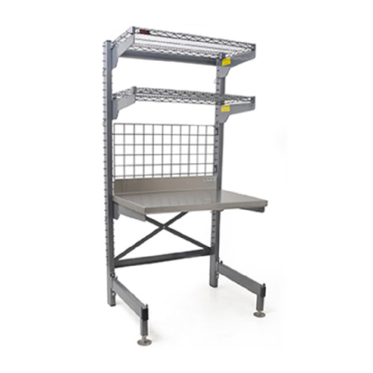 The Eagle Q2436V76-TS Q-LEVER Task Station is a highly functional and versatile workspace solution, designed with precision to meet the needs of various industrial segments. This task station features a 36"W x 24"D 14/304 stainless steel table top, ensuring durability and resistance to corrosion, making it ideal for environments where hygiene and longevity are paramount. The table top is complemented by a 4-1/2"H backsplash, providing additional protection against spills and splashes. The station includes two uprights finished with Valu-Master® gray epoxy, offering sturdy support and a sleek appearance. Furthermore, it comes equipped with two adjustable shelves, also featuring the Valu-Master® gray epoxy finish, allowing for customizable storage options to suit a range of operational requirements. The inclusion of a wall grid enhances organizational capabilities, making it easier to arrange tools and materials efficiently. The unit is supported by robust legs, feet, and an X-brace assembly, ensuring stability and reliability during intensive tasks. The Eagle Q2436V76-TS Q-LEVER Task Station is an exemplary choice for professionals seeking a structured, adaptable, and highly durable workspace, catering to sectors that demand high standards of cleanliness and efficiency.