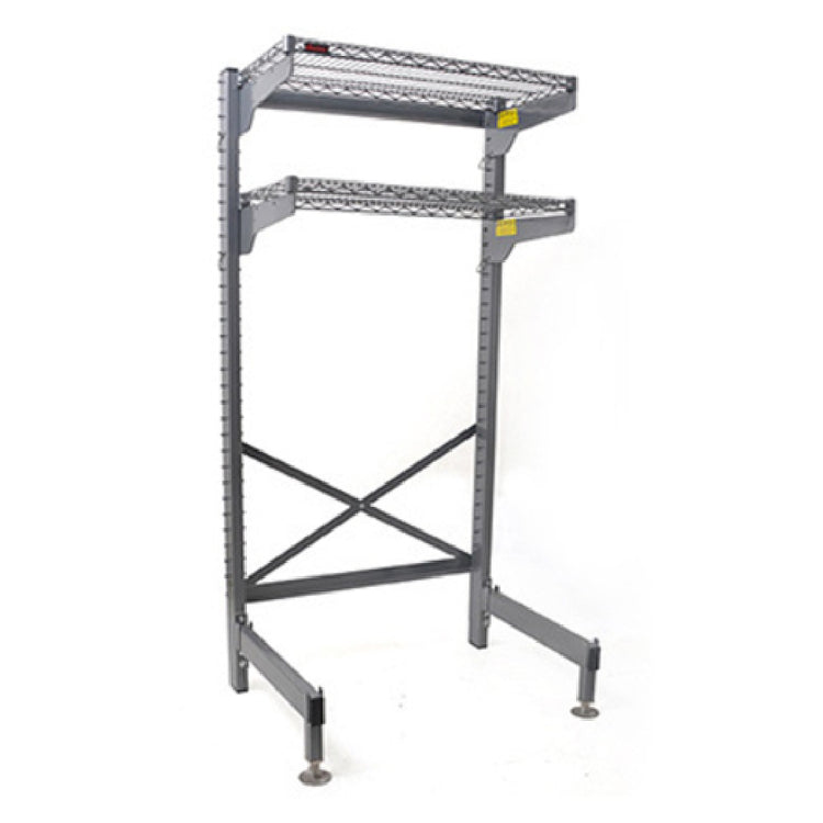 The Eagle Q2442V76-OS Q-LEVER Overhead Storage Station is designed to enhance storage efficiency in various industrial environments. This unit features two uprights, each finished with a Valu-Master® gray epoxy coating, known for its durability and resistance to corrosion, making it suitable for demanding workspaces. Complementing the uprights are two adjustable shelves, also coated with the same Valu-Master® gray epoxy finish, which allows for customizable storage solutions to accommodate different items with ease. The inclusion of legs and feet ensures stability, while the X-brace assembly provides additional support, enhancing the structural integrity of the storage station. This comprehensive setup is ideal for sectors that require robust and adaptable storage solutions, such as manufacturing, warehousing, or even commercial kitchens. Its practicality and design cater to varying storage needs, offering a balance of strength and versatility. The Eagle Q2442V76-OS stands out as a reliable choice for those seeking to optimize space without compromising on quality or performance.