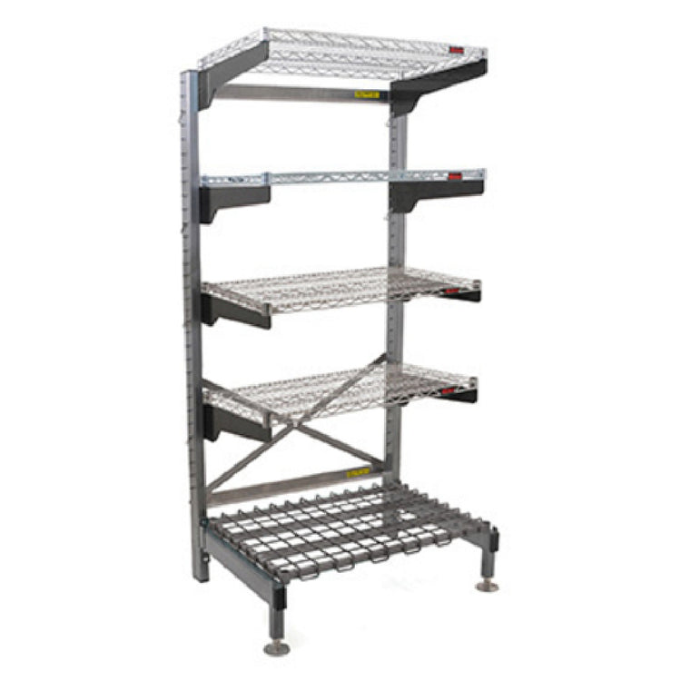 The Eagle Q2466VG76-5D Q-LEVER Cantilever Shelving Unit is a versatile and robust storage solution, catering to the diverse needs of various industry segments. This 5-tier shelving unit stands out with its overall dimensions of 70"W x 29"D x 76"H, offering ample storage space while optimizing floor area. It features four 66"W x 24"D wire shelves, crafted with a Valu-Gard® green epoxy finish, ensuring durability and corrosion resistance. The inclusion of a bottom dunnage rack adds to the unit's functionality, providing additional support for heavier items. Engineered with two sturdy uprights finished in a gray Valu-Master®, the shelving unit guarantees stability and strength. Its adjustable leveling feet make it adaptable to uneven surfaces, enhancing its usability in various environments. This unit is NSF certified, reflecting its compliance with high standards of safety and quality. The Eagle Q2466VG76-5D is ideal for businesses seeking a reliable shelving solution that offers both functionality and resilience. Whether used in commercial kitchens, warehouses, or retail spaces, this cantilever shelving unit supports efficient organization and storage, accommodating a wide range of applications with its exceptional design and engineering.