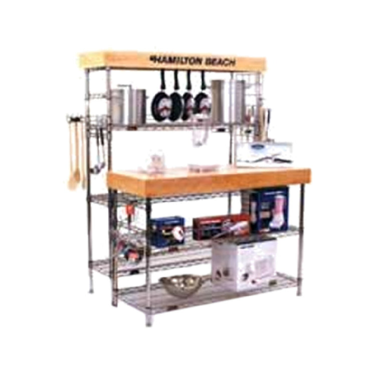 The Eagle RDW48CB Retail Display Workstation is a versatile and robust free-standing unit, measuring 50"W x 36"D x 63"H, designed to meet varied retail and commercial needs. It features a rear shelf unit capped with a durable hardwood finish, offering both aesthetic appeal and practicality. The workstation boasts four 48" x 14" chrome wire shelves supported by four 63" posts, providing ample storage and display space for merchandise. Additionally, it includes a 34"H table also capped with a hardwood finish, enhancing its functionality as a display or workspace. Underneath, two 48" x 18" chrome wire undershelves offer further storage solutions, ideal for organizing and accessing inventory efficiently. The four posts ensure stability and sturdy support for all shelving components. This workstation is particularly suited for retail environments where showcasing products while ensuring easy access is essential, as well as in other industries requiring organized display and storage solutions. Its combination of durable materials and practical design makes the Eagle RDW48CB a valuable asset for businesses seeking to enhance their display capabilities with a reliable and visually appealing unit.
