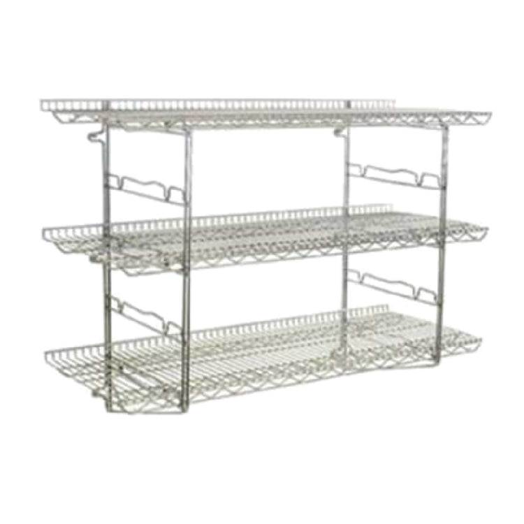 The Eagle S2-3B-SSW1836C Piggyback Wall-Mounted Shelf Kit is a highly functional and versatile storage solution featuring a 3-tier configuration with dimensions of 36"W x 18"D. This kit includes two open wire shelves designed with the innovative Quad-Truss® technology, which enhances the structural integrity and load-bearing capacity, making it suitable for various commercial applications. The inclusion of two 23-7/8"H wall brackets allows for easy mounting directly to studs, eliminating the need for wall backing, thus simplifying installation. The shelves are finished in chrome, providing a sleek, modern appearance while ensuring durability and resistance to corrosion. Certified by NSF, this shelf kit meets rigorous public health and safety standards, making it an excellent choice for commercial kitchens, healthcare facilities, and retail environments where hygiene and reliability are paramount. Whether used for storing kitchen supplies, office essentials, or retail merchandise, the Eagle S2-3B-SSW1836C offers unparalleled versatility and functionality, designed to accommodate the diverse needs of professionals across various industries.
