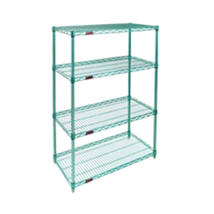The Eagle S4-63-2436E Starter Shelving Unit is a sophisticated and durable solution for diverse storage needs across various industries. This 4-tier shelving unit measures 36 inches in width, 24 inches in depth, and 63 inches in height, making it an ideal fit for compact spaces while offering ample storage capacity. Its wire shelves incorporate the patented QuadTruss® design, which enhances stability and weight-bearing capacity, ensuring reliable performance in demanding environments. The unit includes four 63-inch-high posts, providing structural integrity and adaptability for various storage configurations. Finished with the EAGLEgard® hybrid epoxy coating, this shelving unit features MICROGARD® antimicrobial protection, effectively inhibiting the growth of bacteria and maintaining high hygiene standards, which is crucial in sectors like food service and healthcare. The unit is a Knock-Down (KD) design, allowing for easy assembly and transportation, and is NSF certified, affirming its compliance with rigorous public health and safety standards. The Eagle S4-63-2436E Starter Shelving Unit is a superior choice for warehouses, commercial kitchens, and laboratories, combining innovative design with robust materials to meet the precise needs of professional storage solutions.