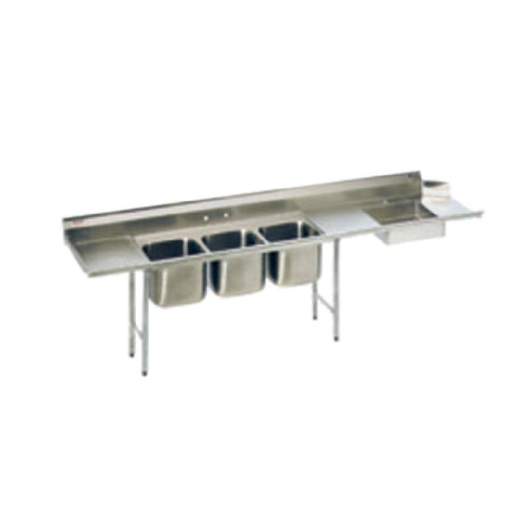 The Eagle SDTPL-124-16/4 Soiled Dishtable/3-Compartment Pot Sink Straight Design is a versatile and efficient solution for commercial kitchens requiring robust dishwashing and pot washing capabilities. With a straight design measuring 124 inches in width, this unit is optimized for left-to-right operation, streamlining workflow processes. The product features an 8-inch high backsplash to prevent water spillage and ensure cleanliness. It includes a 20-inch by 20-inch by 5-inch deep pre-rinse sink, facilitating pre-cleaning tasks before washing. The core component of this product, the three 16-inch wide by 20-inch front-to-back by 14-inch deep pot sink bowls, provides ample space for washing large pots and kitchenware. Constructed from 16/430 stainless steel, the top ensures durability and corrosion resistance, essential for heavy-duty kitchen environments. Rolled rims on the front and end add to the structural integrity. The galvanized legs and cross-bracing provide a stable foundation, while the adjustable metal bullet feet allow for precise leveling on uneven surfaces. NSF certification underscores its adherence to public health and safety standards, making it a reliable choice for commercial foodservice operations. This product is tailored to meet the high-volume, rigorous demands of various segments within the food industry.