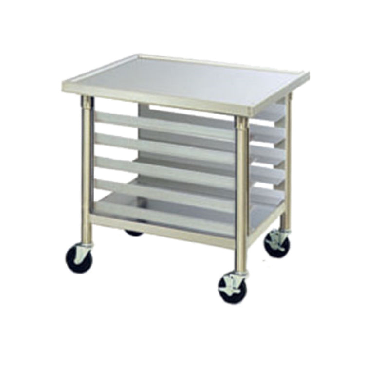 The Eagle T3030SEM-ST-CAH Equipment Stand Mobile is a versatile piece of equipment designed to meet the demanding needs of various industry segments. With a dimension of 27-1/8"W x 31-1/8"D x 34"H, this stand supports a maximum capacity of 600 lbs, ensuring robust performance. Its 14/304 stainless steel top is engineered for durability and easy cleaning, featuring a box marine edge on all sides to prevent spillage and enhance structural integrity. The stand includes a removable pan rack capable of holding five 18" x 26" pans, making it ideal for culinary operations that require flexible storage solutions. A fixed stainless steel undershelf provides additional storage space, while the Uni-Lok® gusset system and fully welded construction ensure exceptional stability and strength. The equipment stand is supported by stainless steel legs and 5" swivel casters with resilient tread, two of which are braked, facilitating effortless mobility and secure positioning. This meticulously crafted equipment stand is designed to deliver reliable performance and adaptability in various settings, making it a valuable asset for commercial kitchens, catering services, and food processing environments where efficiency and durability are paramount.