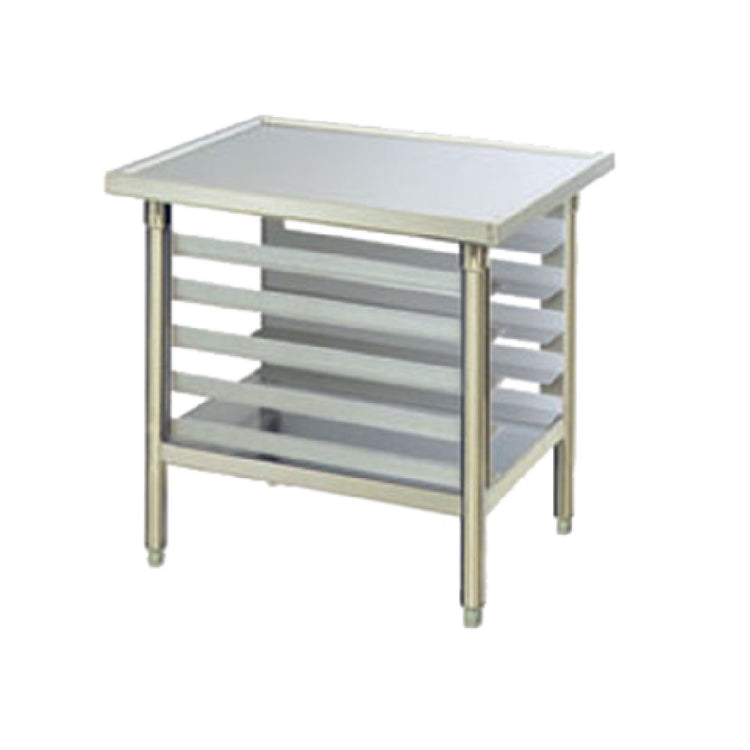 The Eagle T3030SEM-ST Equipment Stand - stationary, measures 27-1/8"W x 31-1/8"D x 34"H, and is engineered to support a maximum capacity of 600 lbs, making it suitable for a variety of industrial and commercial settings. Its 14/304 stainless steel top is designed with a box marine edge on all sides, enhancing its durability and ensuring spilled materials remain contained, making it ideal for environments where cleanliness and efficiency are paramount. The stand features a removable pan rack that accommodates up to five 18" x 26" pans, offering significant versatility for food service operations requiring organized storage solutions. A fixed stainless steel undershelf provides additional storage, maximizing utility without sacrificing structural integrity. The Uni-Lok® gusset system contributes to the stand’s stability and sturdiness, ensuring it can withstand rigorous use. Fully welded construction further enhances its robustness. Stainless steel legs equipped with adjustable bullet feet allow for precise leveling on uneven surfaces, thereby improving equipment stability and operational safety. This equipment stand's thoughtful engineering and high-quality materials make it an indispensable asset for kitchens, bakeries, and laboratories where reliable support for heavy equipment is essential.