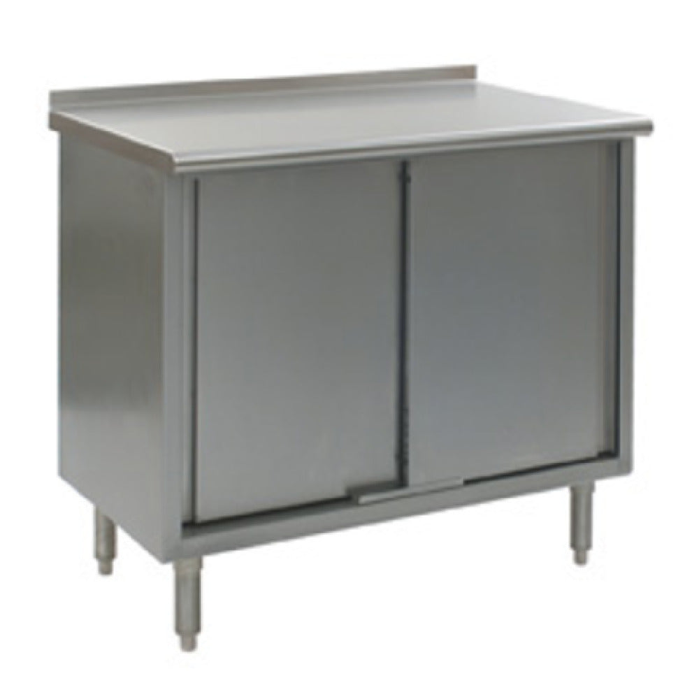 The Eagle UCB3036SE Spec-Master® Series Work Table Cabinet Base With Sliding Doors is a versatile industrial solution, tailored for various industry needs. It features a 36-inch wide and 30-inch deep stainless steel work surface, optimized with a 1-1/2-inch high rear up-turn to prevent spillage and maintain a clean workspace. The table's top is made from durable 14/304 stainless steel, renowned for its strength and corrosion resistance, ensuring longevity and reliability in demanding environments. The rolled front edge adds safety and aesthetic appeal, reducing sharp edges. Below the work surface, the unit boasts a cabinet base with two smooth-operating sliding doors for efficient storage access, saving space in tight work areas. Constructed with a stainless steel cabinet body, it is built to withstand rigorous use. The incorporation of the Uni-Lok® gusset system enhances structural stability, ensuring the table remains sturdy under heavy loads. Supported by four robust legs complete with adjustable bullet feet, the table can be leveled on uneven surfaces, enhancing its versatility across various settings. NSF certification underscores its compliance with strict public health and safety standards, making it an exceptional choice for food service and laboratory environments that demand high standards of quality and reliability.