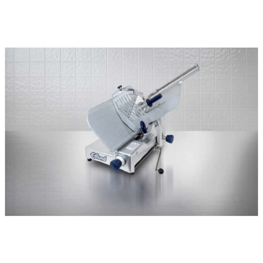 Edlund, EDV-13, Edvantage™ Meat Slicer, electric, tabletop, 33"L x 22.5"W x 27.5"H, manual, gravity feed, belt driven, 13" dia. forged, hardened, carbon steel blade, removable carriage, safety interlock system, stainless steel pusher rod, blade guard safety micro switch, Tritan™ clear hand guard, dual ergonomic handles, blue indicator light, safety overload switch, sealed housing, built-in dual stone sharpener, removeable slice deflector, includes: blade removal tool, anodized cast aluminum & stainless steel construction, 115v/60/1-ph, 1/2HP, ETL Sanitation, cULus, UL EPH Classified
