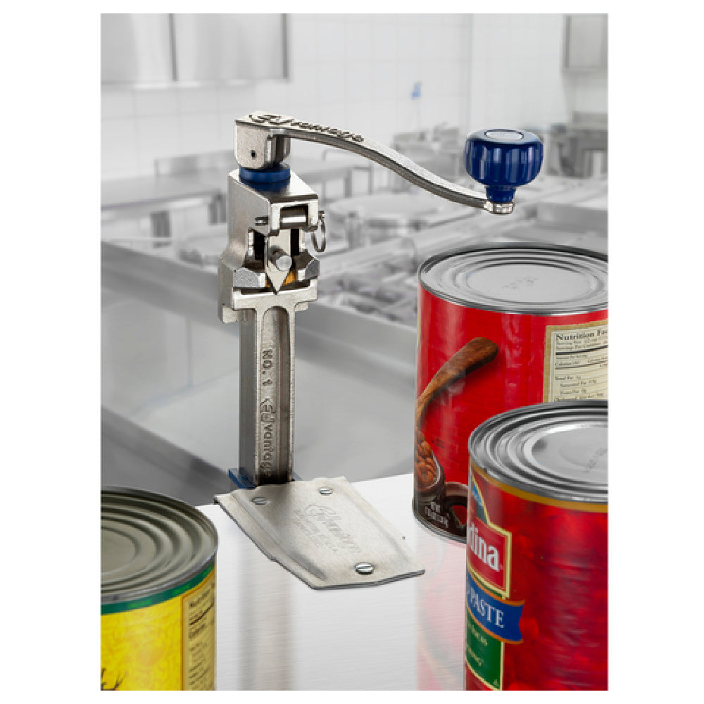 The Edlund EDV-1SS #1 Edvantage™ Can Opener with Stainless Steel Base incorporates advanced Edvancoat™ technology designed to enhance durability and performance in demanding environments. Featuring a 4-side knife, this can opener delivers up to 10,000 openings before the necessity for replacement, offering extended utility for high-volume kitchens. The inclusion of a large ergonomic knob ensures ease of use, catering to users who prioritize comfort during repetitive tasks. Notably, the tool-free disassembly feature simplifies maintenance, allowing for swift and efficient cleaning, which is particularly beneficial in fast-paced food service settings. Manufactured in the USA, the Edlund EDV-1SS underscores its commitment to quality and reliability, making it a preferred choice for a variety of market segments, including restaurants, catering services, and industrial kitchens that demand robustness and efficiency. The stainless steel base adds to its durability, ensuring that the can opener withstands extensive use without compromising on performance. This product exemplifies a blend of innovative technology and user-centric design, positioning it as a valuable asset in any professional kitchen.