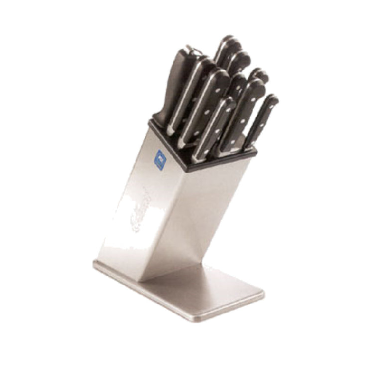The Edlund KBS-2006 Knife Block - a kitchen essential with 6 open slots and a height of 9 inches - is designed for both professional and home chefs who value organization and efficiency. This knife block features a removable insert, allowing for easy cleaning and maintenance, and is fully dishwasher safe, ensuring convenience and hygiene. The stainless steel housing and base provide a sleek, modern appearance while offering durability and stability. Certified by NSF, this knife block meets high public health and safety standards, reinforcing its quality and reliability. Made in the USA, the Edlund KBS-2006 Knife Block exemplifies American craftsmanship and innovation. Its thoughtful design makes it a versatile addition to any kitchen, supporting various knife types and sizes, and serving the needs of culinary professionals and enthusiasts alike. This product's combination of functionality, safety, and style makes it a distinguished choice in the competitive market of kitchen accessories.