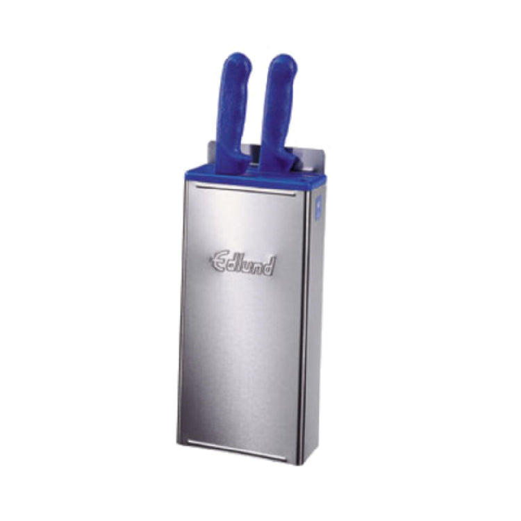 The Edlund KR-50B Knife Rack is a versatile and sturdy storage solution designed for professional kitchens and culinary environments. Measuring 12 inches, this knife rack features pop-out high impact and high temperature inserts, ensuring durability and longevity even in demanding conditions. It is dishwasher safe, facilitating easy cleaning and maintenance. The rack includes a full-length stainless steel back plate, providing additional support and stability. It is engineered to hold a variety of knives and tools: 1 cleaver or 2 chef knives, 3 slicers, 4 paring knives, and 1 steel, making it a comprehensive storage option for chefs requiring quick and organized access to their essential tools. The Edlund KR-50B is available in a striking blue color and is NSF certified, signifying its adherence to strict public health and safety standards. This knife rack is particularly valuable for foodservice operations that demand high standards of hygiene and efficiency, ensuring that knives are stored safely and within easy reach. The combination of its robust construction, flexibility in storage capacity, and compliance with safety standards makes the Edlund KR-50B Knife Rack an essential asset for professional culinary settings.