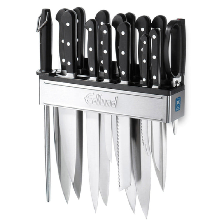 The Edlund KR-698 Knife Rack is designed with a short skirt and features innovative pop-out high impact and high temperature inserts, making it highly durable and adaptable for various kitchen environments. This knife rack can accommodate up to 8 chef's knives, 2 smaller knives, 1 steel, and 1 pair of scissors, providing ample storage for professional culinary settings. Constructed from stainless steel, this rack is not only robust but also dishwasher safe, ensuring ease of cleaning and maintenance. The NSF approval highlights its compliance with stringent public health and safety standards, making it a reliable choice for commercial kitchens. Proudly made in the USA, the Edlund KR-698 Knife Rack stands out in the market for its combination of durability, safety, and functionality. The advanced design features cater to diverse market segments, including busy restaurants, catering services, and high-volume food preparation operations, offering them an efficient and organized solution to manage their essential kitchen tools.