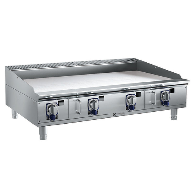 The Electrolux 169184 (LV169184) EMPower Restaurant Range Griddle-Gas is a versatile countertop unit measuring 48 inches wide, designed to meet the demanding needs of professional kitchens. Its smooth, scratch-resistant chromium surface ensures durability and easy cleaning, while the integrated grease collector drawer and splashback help maintain a tidy workspace. This griddle is equipped with thermostatic controls and a pressure regulator, allowing precise temperature management for optimal cooking results. It includes a main shut-off valve for added safety and a scraper (164255) for maintenance convenience. Built with robust stainless steel construction, it features 4-inch adjustable and removable legs for customizable installation. The unit operates at 30.4 gas kW and 104,000 BTU, making it a powerful choice for high-volume food service environments. Certified by cETLus and ETL-Sanitation, this griddle is configured for natural gas and includes an LP conversion kit, ensuring compatibility with various gas types. The Electrolux 169184 is designed to deliver reliable performance and efficiency, making it an excellent addition to restaurants seeking high-quality cooking equipment that meets rigorous industry standards.