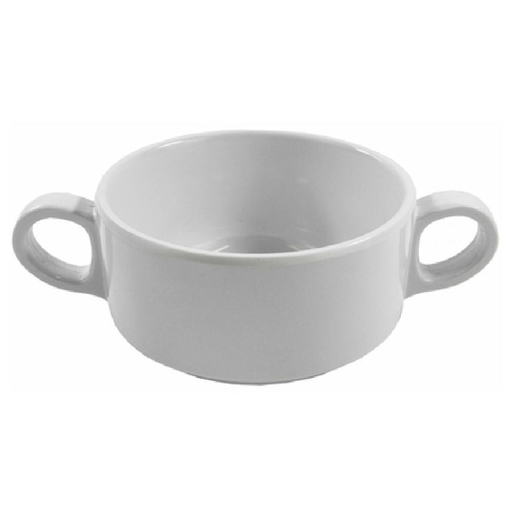 The Elite Global Solutions DC418-W Cup is a highly versatile and durable dining essential, measuring 4-1/4 inches in diameter and 2 inches in height, with a generous capacity of 10 ounces. Crafted from high-quality melamine, this cup is engineered to withstand the rigors of daily use, boasting resistance to breaking, chipping, staining, and scratching. Its classic round design is complemented by two ergonomic handles, ensuring ease of use and a secure grip. The cup's pristine white finish adds a touch of elegance to any setting, seamlessly blending with various tableware collections. Designed with practicality in mind, the DC418-W is dishwasher safe, simplifying cleanup and maintenance. Additionally, it is BPA free, providing a safe drinking experience for users. This cup is part of the Simplicity collection, known for its understated style and robust performance, making it an ideal choice for various industry segments, including hospitality, healthcare, and educational institutions. Each case contains six of these durable cups, catering to both small and large-scale service needs. The Elite Global Solutions DC418-W Cup exemplifies the perfect balance of form and function, offering a reliable solution for professionals seeking quality and longevity in their tableware selections.