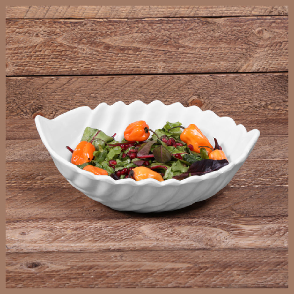 Elite Global Solutions M113L-NW Bowl 1-3/4 Qt. (56 Oz.) 11-1/4"L x 7-1/4"W x 3-3/4" - 4-3/4"H is a large, leaf-shaped bowl designed for versatility and durability. Made from BPA-free melamine, this bowl is ideal for both commercial and home dining settings. It combines the elegance of a unique leaf shape with practical features like being break, chip, stain, and scratch-resistant, ensuring longevity in high-use environments. Its dishwasher-safe nature simplifies maintenance, offering convenience for busy kitchens. The display white color adds a touch of sophistication to any presentation, making it suitable for restaurants aiming to enhance their food displays. This bowl is part of "The Naturals" collection, reflecting a style that blends seamlessly with various decor themes. Its ample size is perfect for serving a variety of dishes, from salads to side dishes, accommodating up to 56 ounces or 1-3/4 quarts of content. The Elite Global Solutions M113L-NW Bowl not only meets practical needs but also elevates the dining experience with its thoughtful design and reliable construction, catering to the needs of diverse market segments within the food service industry.