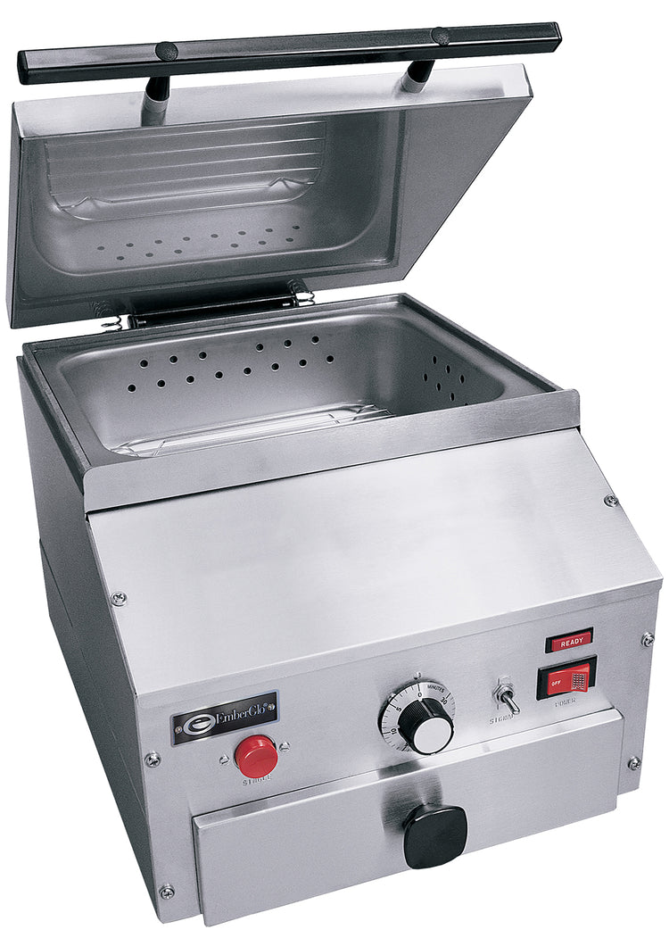 The EmberGlo ES5CTS-5400754 Steamer Tap Water Push Button is a highly efficient, self-contained countertop device designed to meet a variety of culinary steaming needs. With the capacity to hold a 4-inch deep half-size pan, this steamer is ideal for compact kitchen spaces requiring efficient use of countertop areas. It features an automatic 30-minute timer, enhancing convenience and precision in cooking operations. The user-friendly top opening hinged lid ensures easy access, while the 1-gallon capacity removable water reservoir drawer facilitates effortless refilling and cleaning. Constructed from durable stainless steel, this model ensures longevity and reliability in demanding kitchen environments. The steamer operates with a powerful 1.5kW output, providing sufficient energy for consistent performance. It also comes with a pan included, making it ready for immediate use. Certified by NSF and cULus, this steamer complies with high safety and sanitation standards, making it suitable for various food service settings. The EmberGlo ES5CTS-5400754 is designed to cater to professional kitchens, offering robust functionality and ease of use for chefs and culinary professionals seeking high-quality steaming solutions.