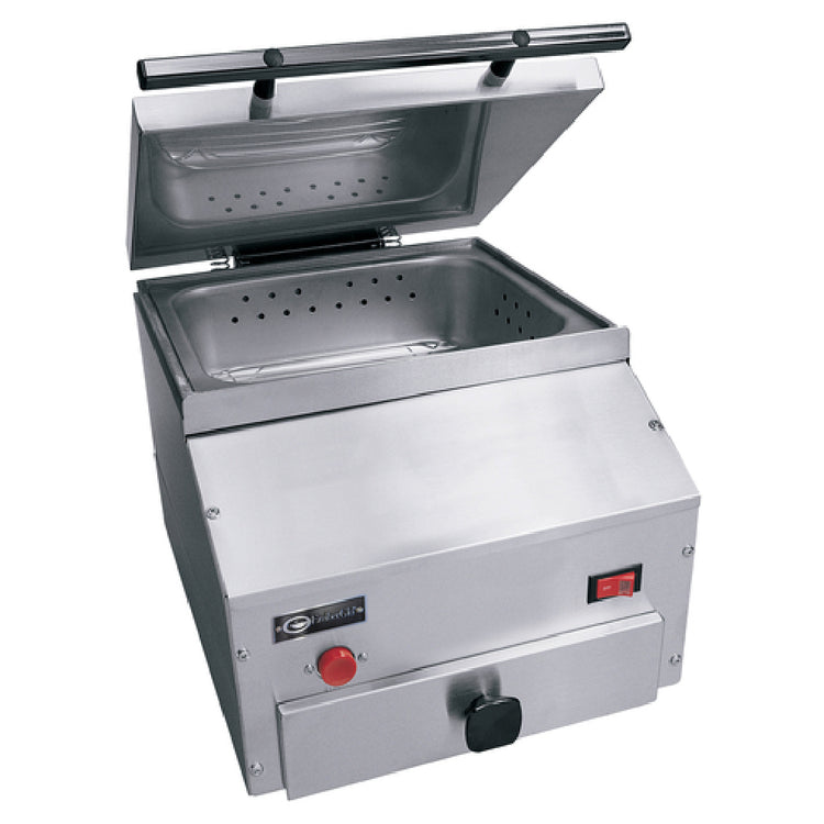 The EmberGlo ES5PBS-5400730 Steamer Tap Water Push Button is an advanced kitchen appliance designed for efficiency and convenience, particularly suited for businesses requiring consistent steaming capabilities in a compact countertop format. Featuring a self-contained design, it includes a 4-inch deep half-size pan capacity, making it ideal for small to medium-scale operations. The unit incorporates a simple yet effective push button mechanism for ease of use, and a top-opening hinged lid for easy access. A notable feature of this steamer is its 1-gallon capacity removable water reservoir drawer, which operates with standard tap water, eliminating the need for any special water supply. Constructed from durable stainless steel, the EmberGlo ES5PBS-5400730 ensures longevity and reliability, while its 1.5kW power capacity guarantees efficient energy usage. The inclusion of the NSF and cULus certifications underscores its adherence to stringent safety and sanitation standards, making it a trustworthy choice for various culinary environments. This steamer is particularly beneficial for kitchens with limited space, providing substantial functionality without occupying a large footprint. Its compact design and robust construction make it an invaluable tool for a diverse array of industries, from restaurants to catering services, seeking to enhance their steaming operations.