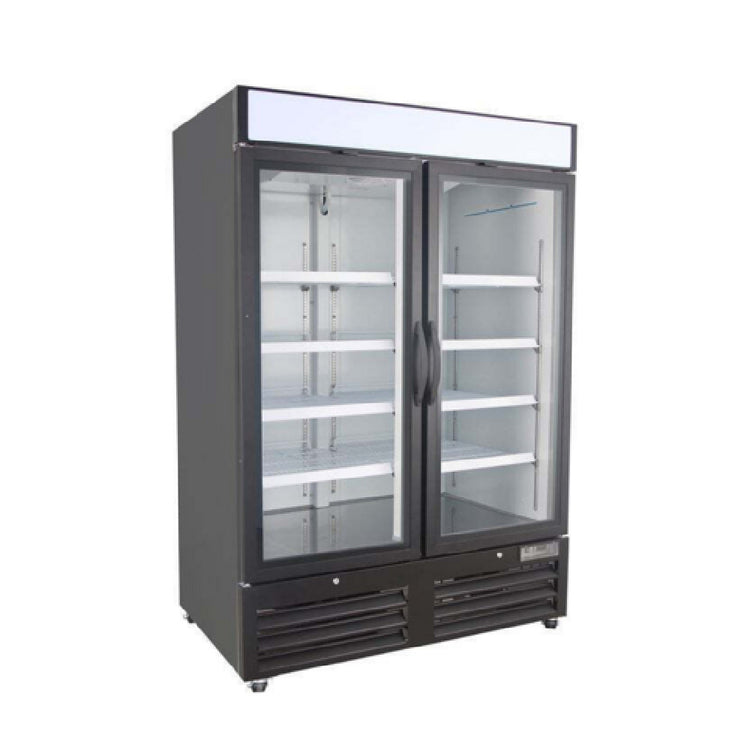 Empura, E-EGM-48FB, Freezer Merchandiser, 54"W x 31.9"D x 81.5"H, 43.8 cu. ft. capacity, (2) swing glass doors, (8) shelves, 2.5" caster, black exterior sides and white interior, 0-10 F temperature range, 1 1/4 HP bottom compressor, self-closing door, low-e triple pane glass door, automatic electric defrost, 3,650 BTU (LBP), NEMA-5-15P power cord, 9 amps, 115v/60Hz/1ph, ETL, ETL Sanitation, Tested and conforms to NSF-7 Standards, Empura Refrigeration