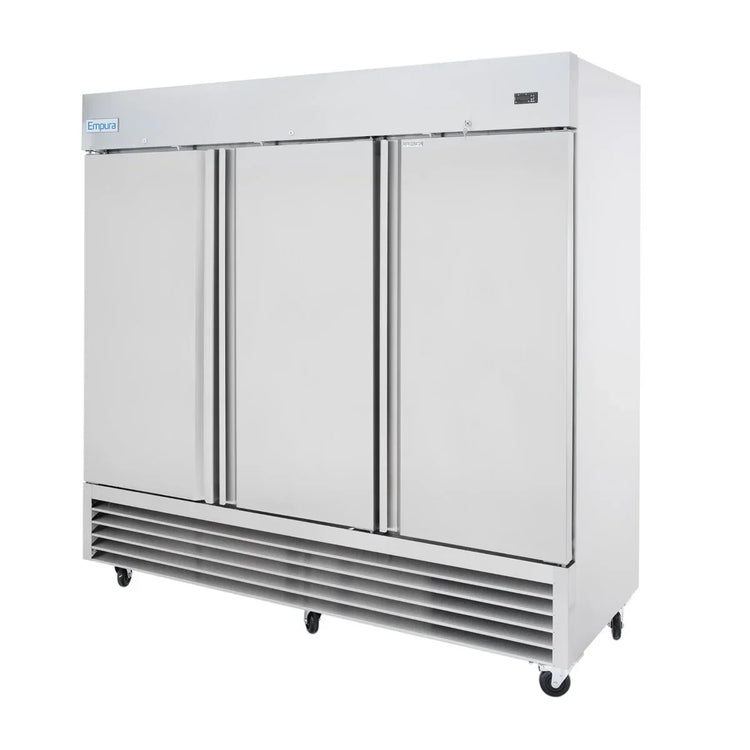 Empura, E-KB81R, Reach-In Refrigerator, 81"W x 32.7"D x 82.3"H, 66 cu. ft. capacity, (3) swing solid doors, (9) shelves, 4" caster, freestanding installation, stainless steel framework, 33F to 41F temperature range, 3/4 HP bottom compressor, R290 CFC-free refrigerant, foam insulation, removable magnetic door gaskets, self-closing doors, automatic defrost, digital temperature control, 7.5 amps, NEMA-5-15P power cord, 115v/60Hz/1ph, ETL, ETL Sanitation, Tested and conforms to NSF-7 Standards, Empura Refrigeration