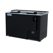 Empura, E-KBC-50, Bottle Cooler, 49.4"W x 27"D x 35"H, 13.7 cu. ft. capacity, (2) solid sliding doors, 2 dividers, 1" casters, black painted exterior finish, 33F to 41F temperature range, 1/8 HP right side reciprocating compressor, 3 amps, NEMA-5-15P power cord, 3,200 BTU (LBP), built-in bottle opener with cap catcher, foamed polyurethane insulation throughout the cabinet, R600a refrigerant, 115v/60Hz/1ph, ETL, ETL Sanitation, Tested and conforms to NSF-7 Standards, Empura Refrigeration