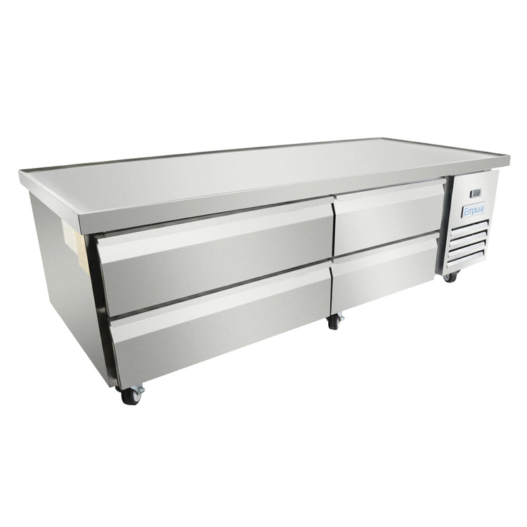 Empura, E-KCBRC72, Refrigerated Equipment Stand, 74"W x 31.9"D x 26.8"H, 11.4 cu. ft. capacity, (4) drawers, 12" x 20" x 6" Pan size fit, 1,100lbs max capacity, stainless steel exterior and interior, 33°F to 41°F temperature range, auto electric defrost, LED temperature display, self-contained refrigeration system, magnetic drawer gasket, 1/5 HP right side compressor, 115v-60hz-1ph, 2.1 amps, NEMA-5-15P power cord, 900 BTU(LBP), R290 CFC-free refrigerant, ETL, ETL Sanitation, Tested and conforms to NSF-7 Standards, Empura Refrigeration