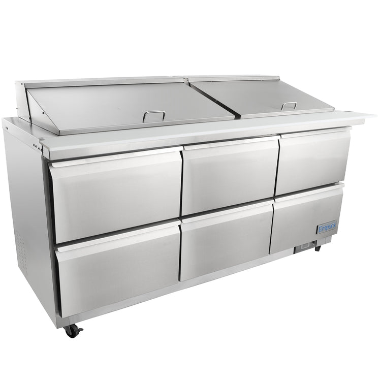 Empura, E-KSP72M-D6, Refrigerated Sandwich/Salad Mega Top Prep Table With Drawers, 71.7"W x 34.5"D x 43.2"H, 15.6 cu. ft. capacity, 6 swing doors, 27 pan capacity, 2.5" caster, painted stainless steel and aluminum framework, 33F to 41F temperature range, 1/3 HP back reciprocating compressor, 1,365 BTU (LBP), R290 CFC-free refrigerant, 3 set drawer, electronic thermostat, 4.3 amps, NEMA-5-15P power cord, 115v/60Hz/1ph, ETL, ETL Sanitation, Tested and conforms to NSF-7 Standards, Empura Refrigeration